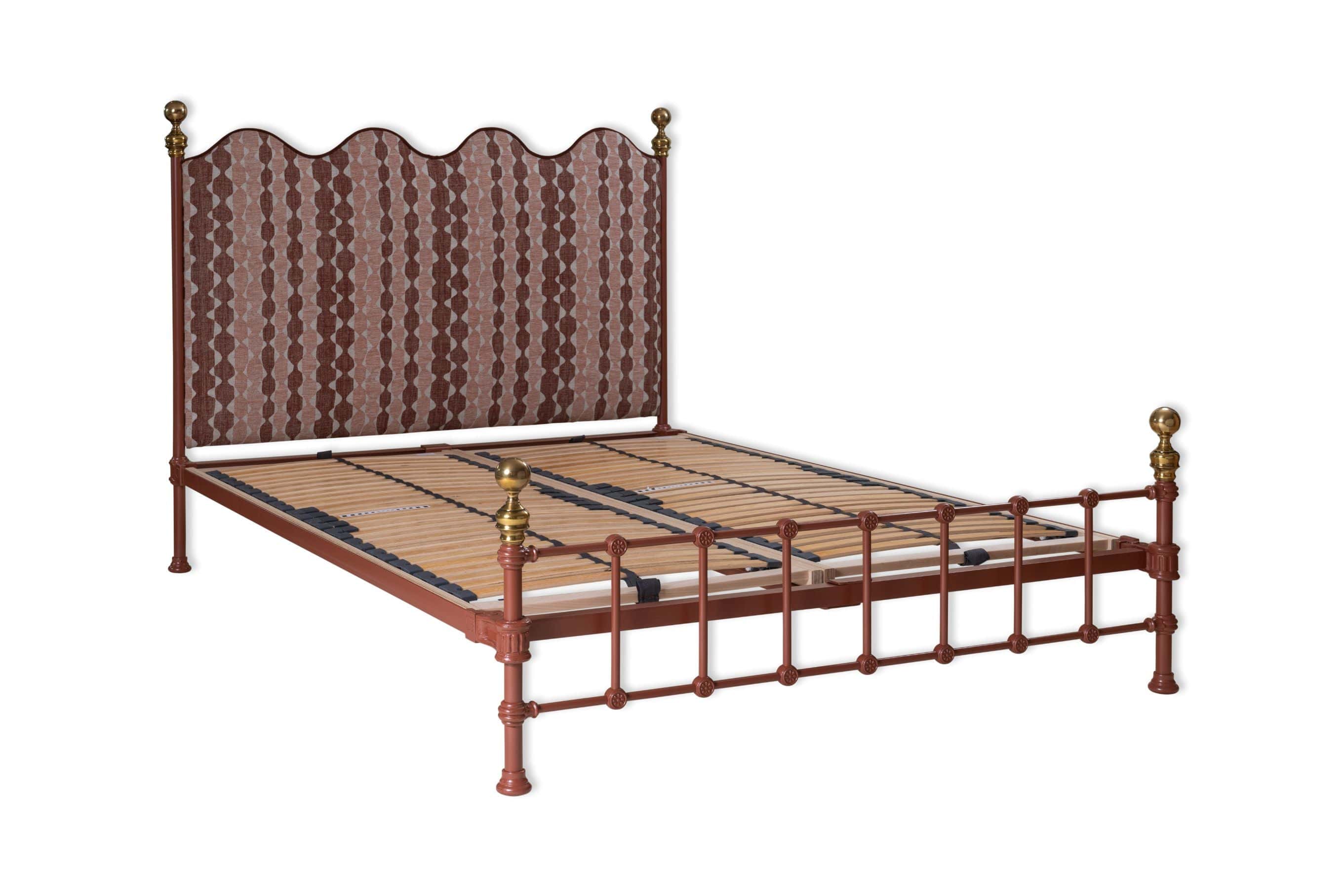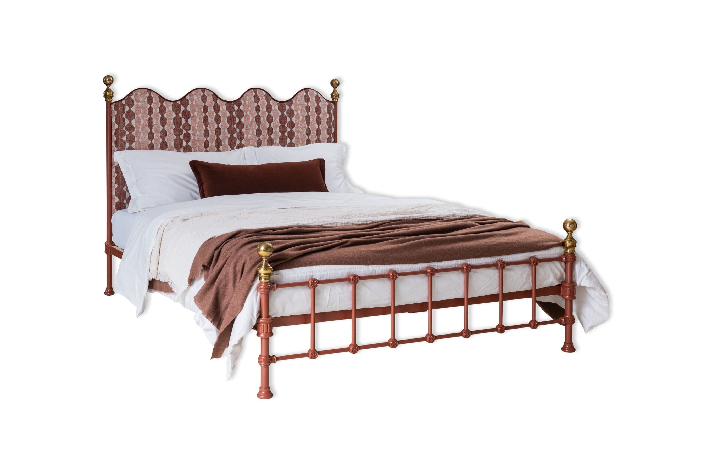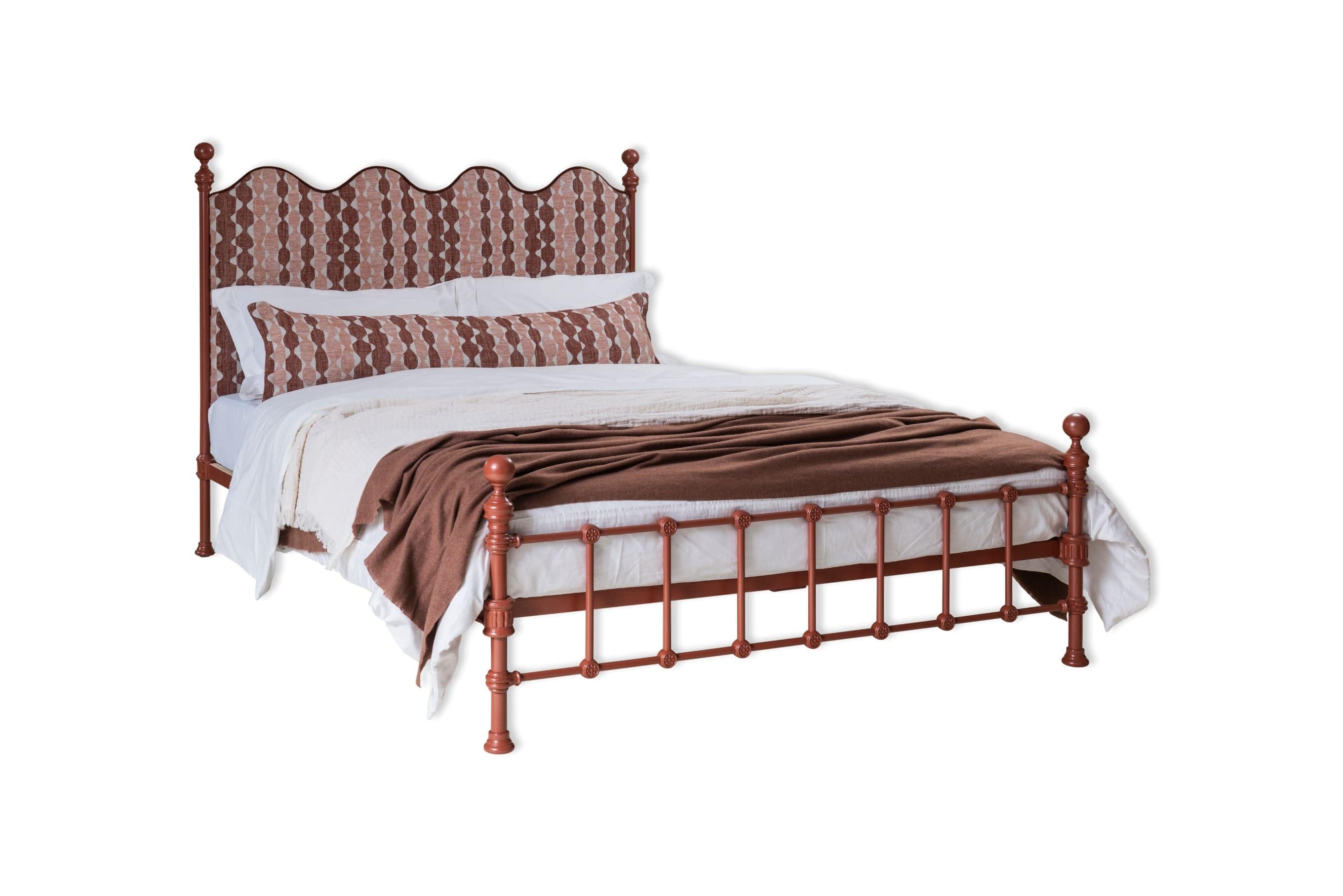 "Whittle in WHIT-002" by Fermoie on the headboard & copper contrast piping with a new Burnt Clay metal frame colour and brass finials.