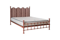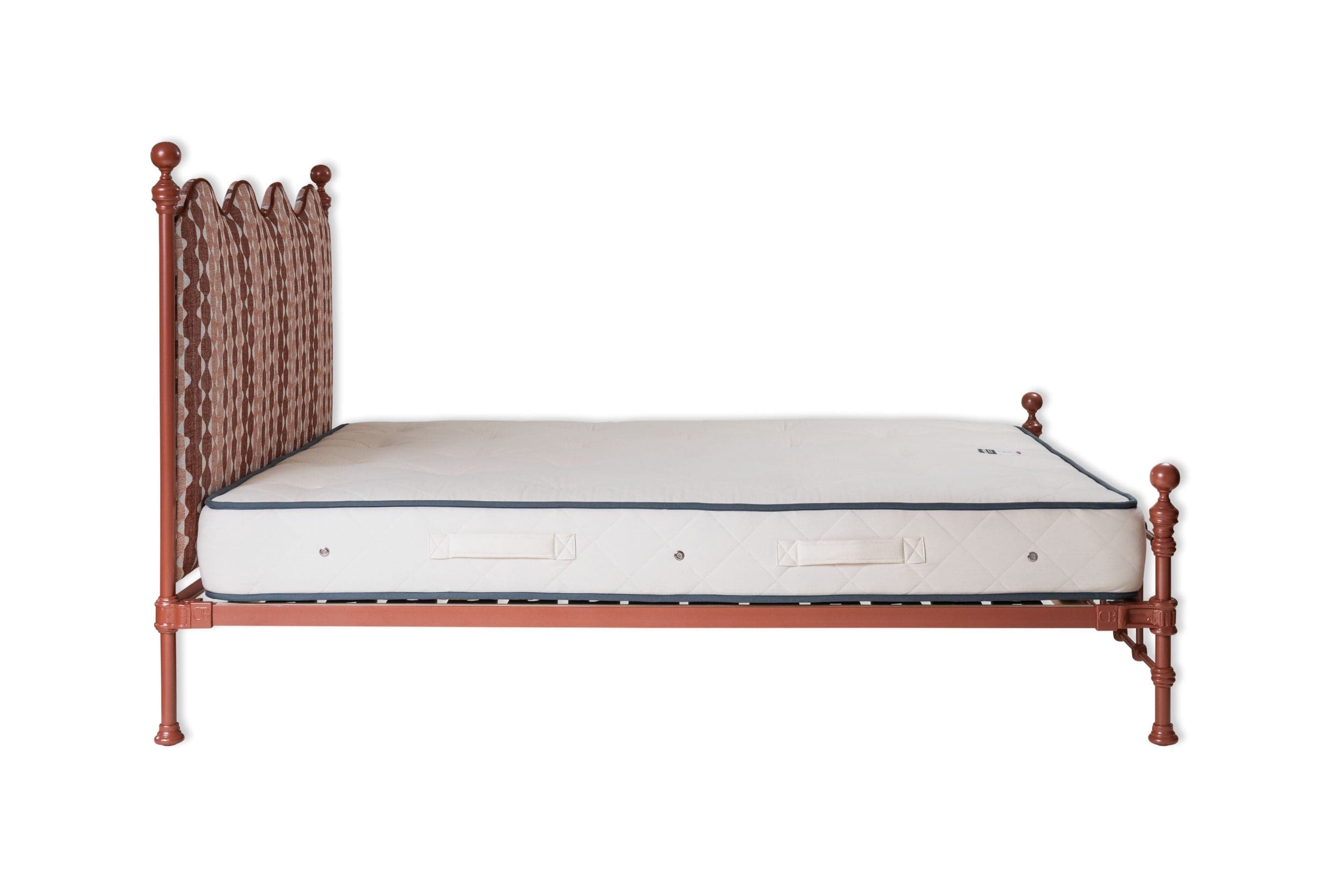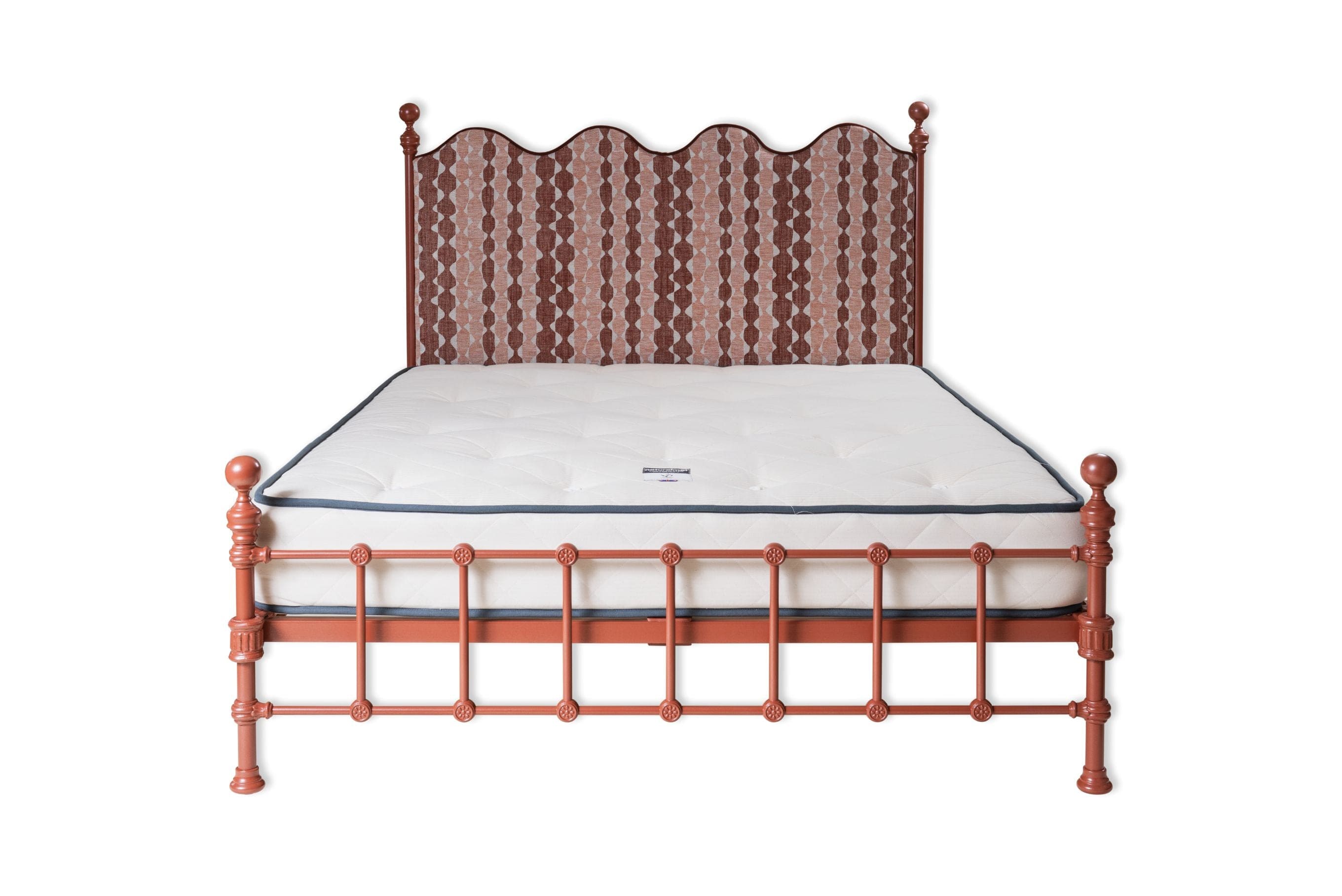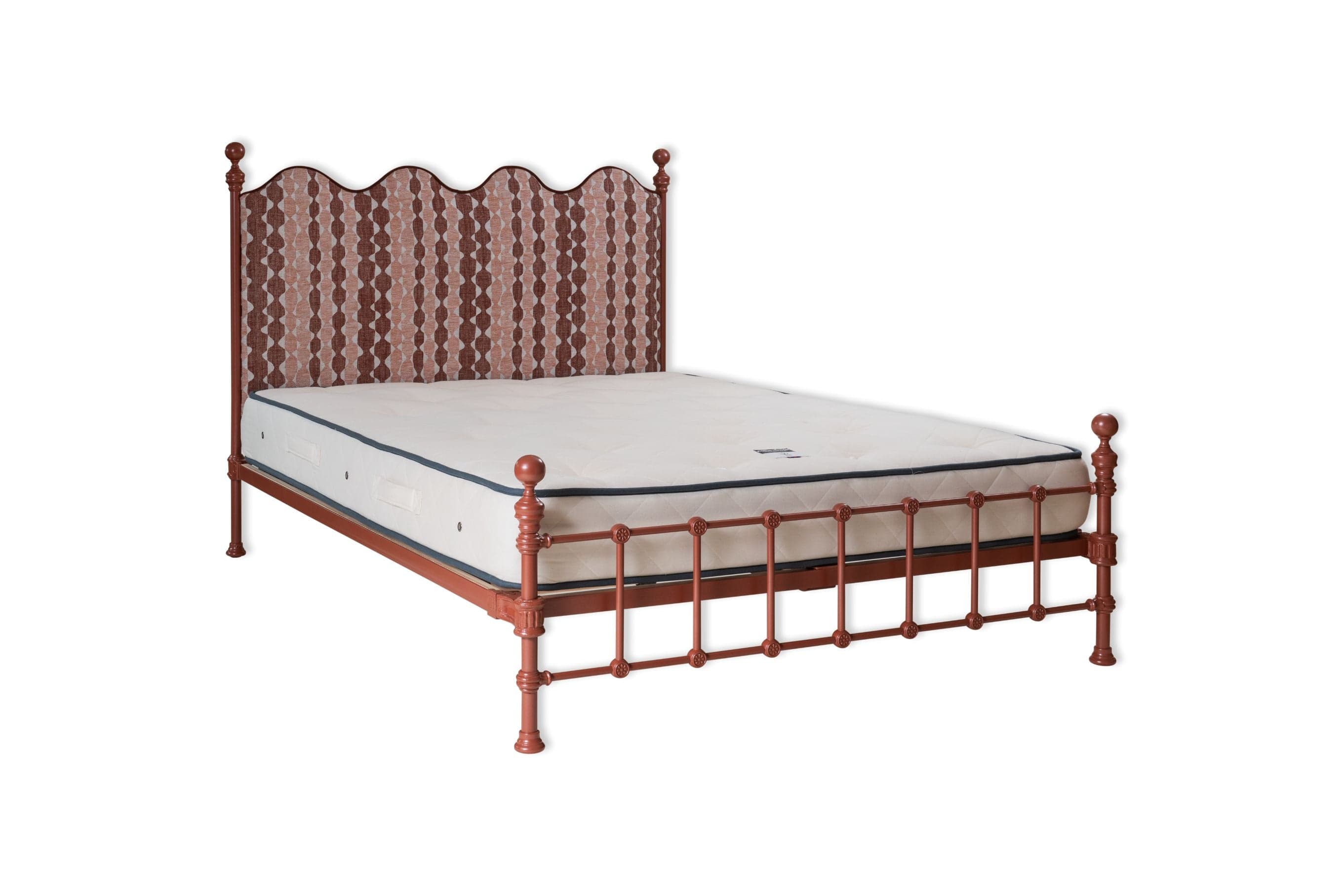 "Whittle in WHIT-002" by Fermoie on the headboard & copper contrast piping with a new Burnt Clay metal frame colour and brass finials.