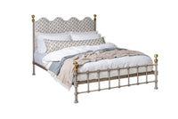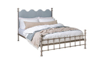 Cornwall coast inspired wavy upholstered headboard framed by timeless metalwork